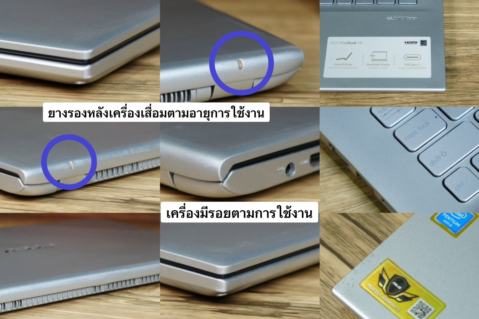 :รอบตัวเครื่องและฝาหลังมีรอยตามการใช้งาน รอยจอนอก หน้าจอมีรอยไบร์ท ยางรองหลังเครื่องเสื่อมตามอายุการใช้งาน ตามรูป สามารถใช้งานได้ปกติทุกอย่าง ***พัดลมมีเสียงตามอายุการใช้งาน***