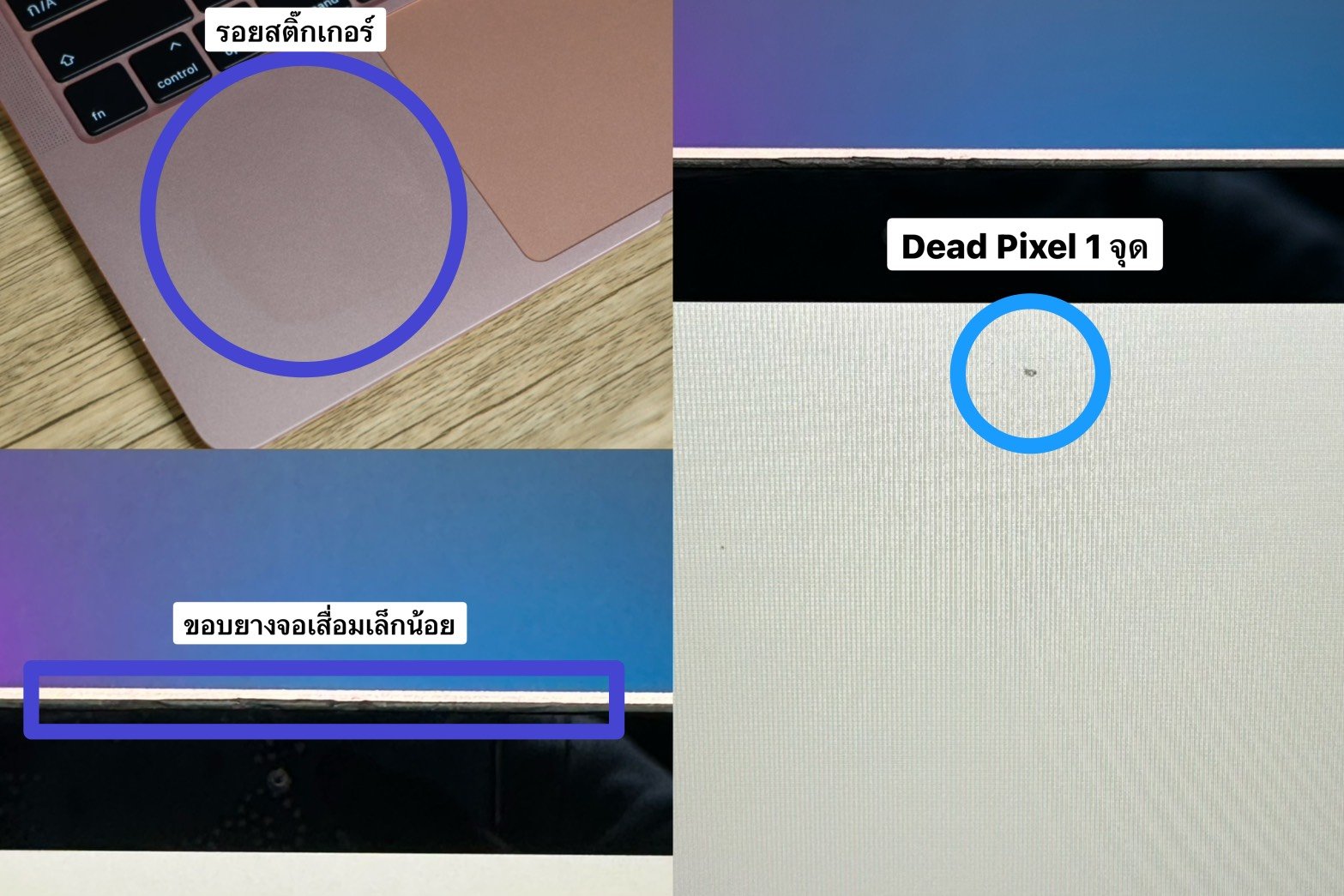 :ตัวเครื่องมีรอยตามการใช้งาน รยอถลอกขอบเครื่อง/บุบมุม รอยคราบสติ๊กเกอร์ ขอบยางจอเสื่อมสภาพตามอายุการใช้งาน รอยจอนอก/จุดDead Pixel 1จุด ตำหนิตามรูป